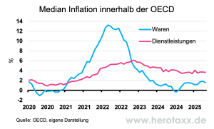 Die Disinflation, die in den vorangegangenen Quartalen zu beobachten war, kam im dritten Quartal 2025 in vielen Ländern zum Stillstand. Steigende Nahrungsmittelpreise, ausgelöst durch ungünstige Wetterbedingungen und Unterbrechungen der Lieferketten, führten zu einem Wiederaufleben der Güterinflation. Gleichzeitig blieb die Dienstleistungsinflation hartnäckig hoch, was auf einen anhaltenden Druck auf die Löhne und die Preise in den Dienstleistungssektoren hindeutete.