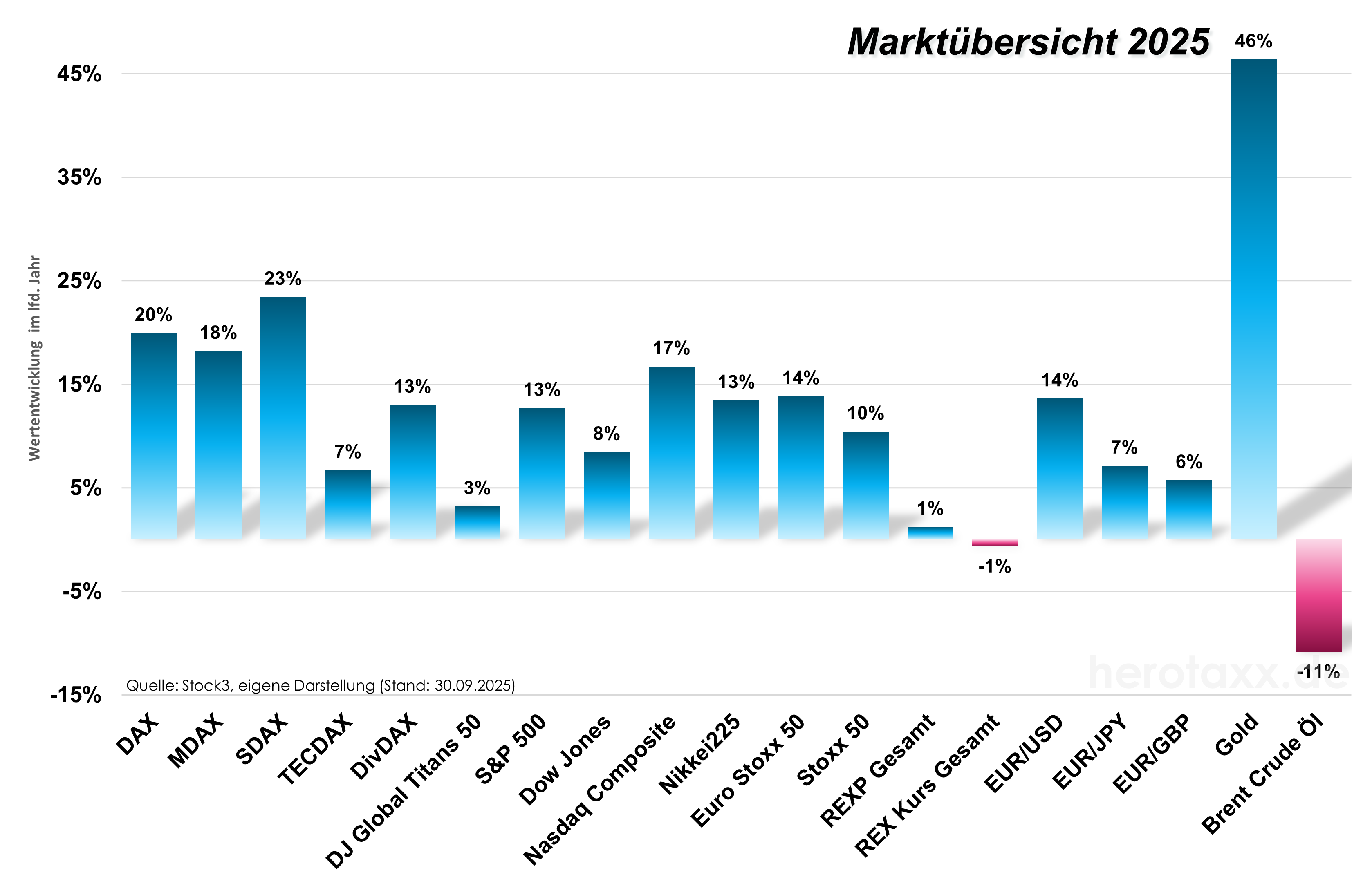 Die Verlangsamung konnte man auch an den Wertpapiermärkten spüren. Die Dynamik der guten Wertenwicklung der Vorquartale ließ in den meisten Assetklassen deutlich nach. Unabhängig davon entwickleten sich US Aktienindizes nach der Einführung von Trump´s Zöllen relativ gut. Dies geschah sogar in einem Umfeld, indem sich der USD gegenüber dem EUR abwertete. Größter Profiteur in diesem unsicheren Umfeld war Gold. Mit bisher über 40% Zuwachs in 2025 bewies es wieder einmal seinen Ruf als Krisenwährung.