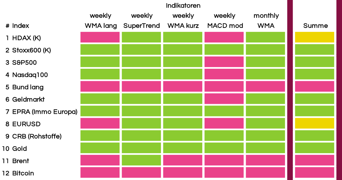 Unser Börsenüberblick Global orientiert sich an unterschiedlichen trendfolgenden Konzepten. Jeder einzelne Indikator gibt dabei klare Kauf,- oder Verkaufsignale. Diese fassen wir in einer summierten Ampelphase auf der rechten Seite der GearBoxx zusammen. Somit erhält man eine Aussage pro Assetklasse - Rot, Gelb oder Grün.